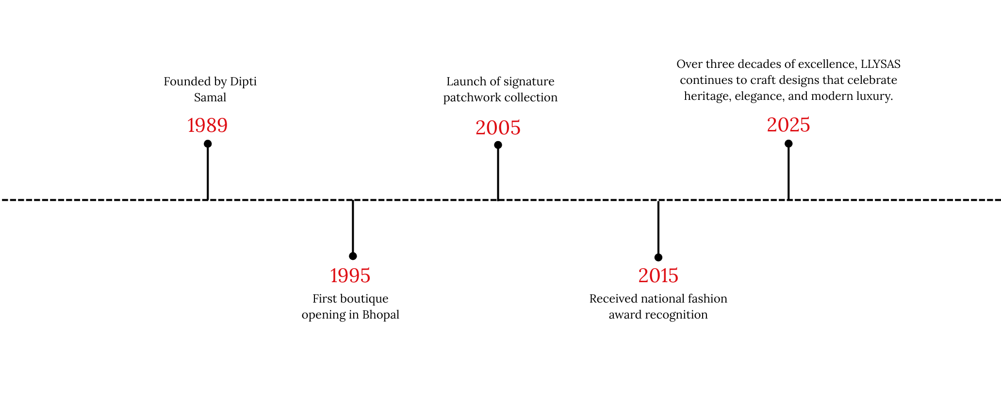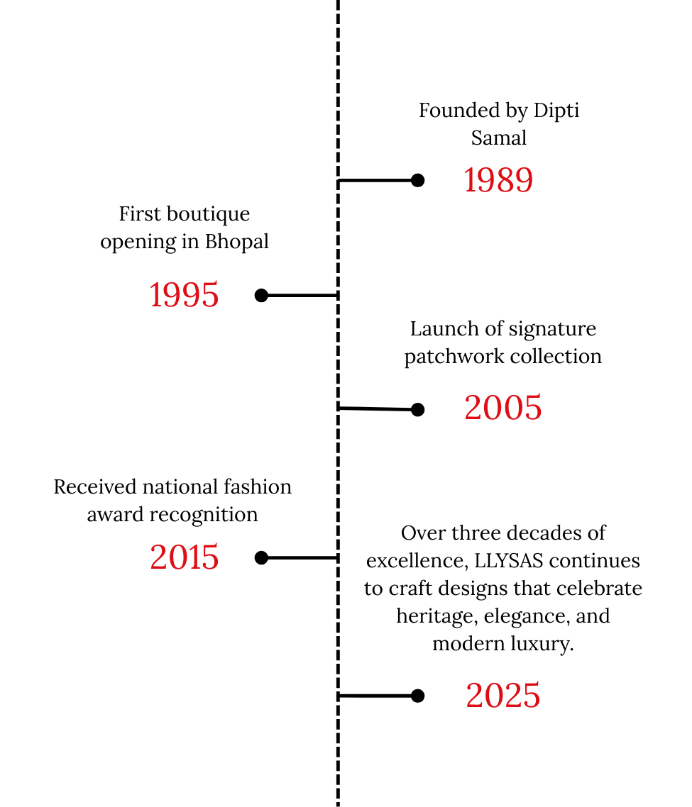 Founded in 1989 in Bhopal by Dipti Samal, Llysas is a heritage fashion label dedicated to handcrafted clothing rooted in Indian tradition. For over three decades, we have created garments that celebrate artistry, individuality, and the beauty of slow, thoughtful fashion.